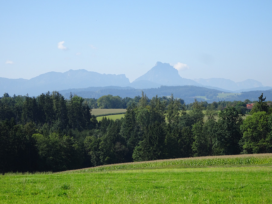 Für unsere Rad-Geocachingtour nutzen wir zur Fahrt nach Kirchdorf, den südlich am Campingplatz vorbei führenden Traunviertler Radweg R13. Es ist zwar nicht die kürzeste Route, aber so weichen wir den Hauptverkehrsstrassen aus. Aus der Ferne sehen wir eine Garnitur der Almtalbahn durch die hügelige Landschaft gleiten. Bei Stampf haben die Regenschauer der letzten Tagen einen Wirtschaftsweg unterspült und versandet. Es wurde unmittelbar vorher ein Absperrgitter. aufgestellt ohne Hinweis und Umleitungsmöglichkeit. Mit kurzzeitigen Schieben und dank des Motors des E-Bike war das Hindernis gut zu überwinden. Am anderen Ende des Weges war ebenfalls eine Absperrung und Hinweise. Ein Rätselspiel für Ortsunkundige. Dank unserem GPS wählten wir bei der Rückfahrt einen Alternativweg, allerdings war die Wegbeschaffenheit nicht besser.