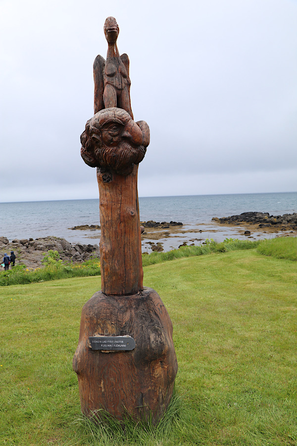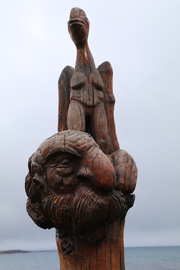 Mich erinnerte es an die Geschichten der Trolle und Elfen, die hier allgegenwärtig in Island sind. Der Kopf, der aus einem Baumstamm heraus schaut, den Blick vom Meer abgewandt ins Landesinnere, darüber eine Frauenfigur mit stilisierten Flügeln und einem vogelähnlichen Kopf. Die Dimensionen beider Figuren passen eigentlich nicht zusammen.