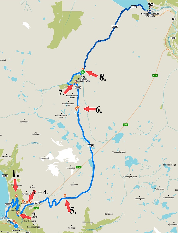- Nach 16 km bei N60.615915, E8.085601 – Parkplatz Hivjufossen eine kurze Wanderung 680 m mit 130 m Höhenunterschied zu einem Aussichtspunkt N60.611983, E8.081073 – Youtube