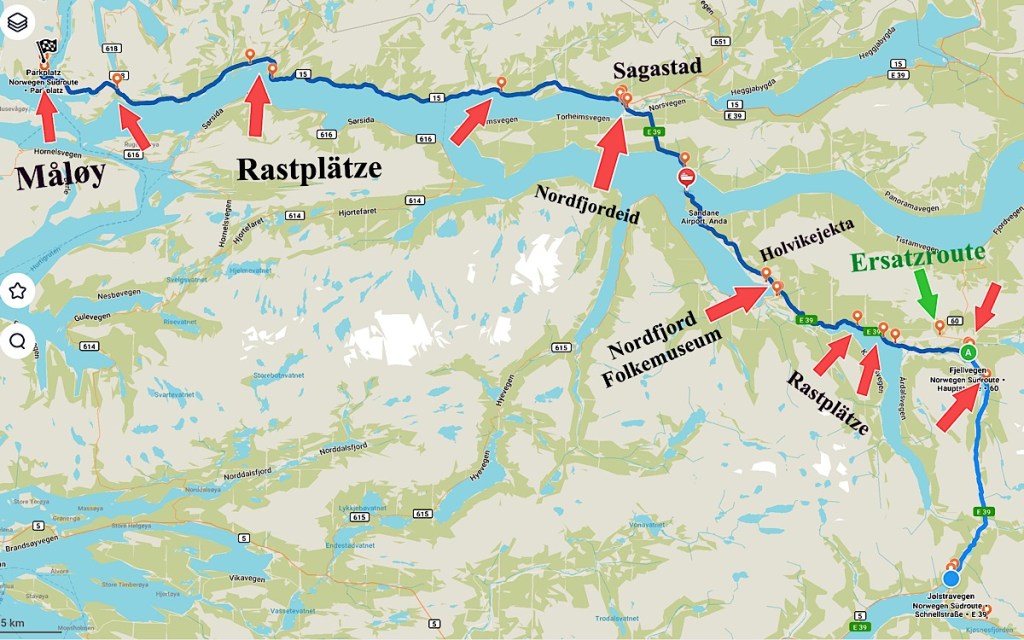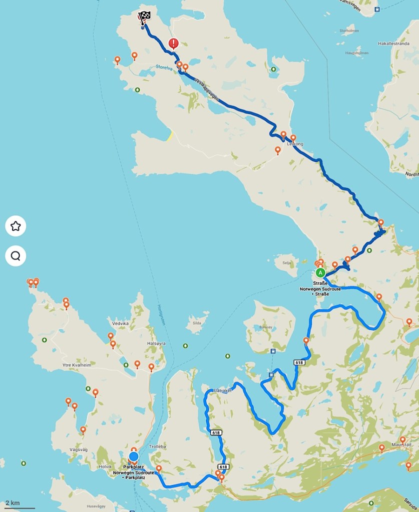 - Start in Måløy am Parkplatz N61.935717 – E5.115875 auf der Strasse 15 nach 7.7 km nach dem Almenningstunnelen bei N61.922301, E5.221021 links abbiegen auf die Strasse 618 Richtung Selje.