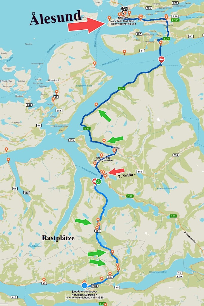 - Nach 3,4 km treffen wir auf die Strasse 62. Wir biegen links ab Richtung Hareid.