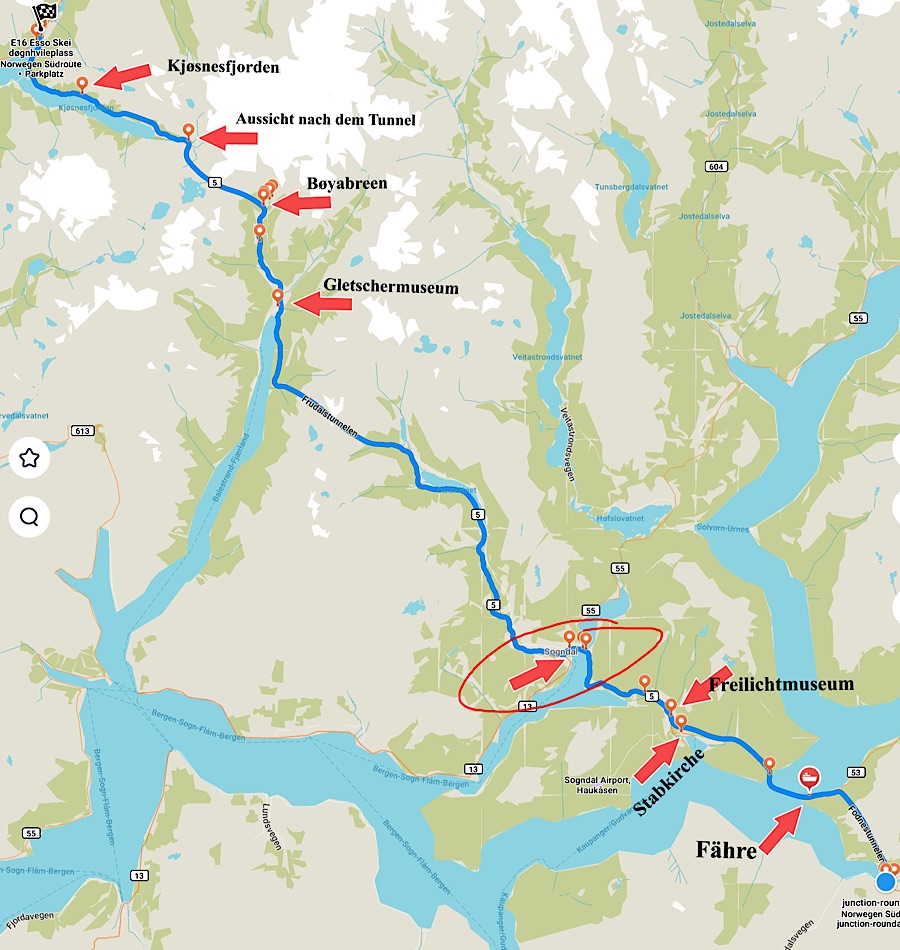 - Sogndal nach 7,5 km – Parkplatzmöglichkeit: N61.231635, E7.102637 – regionales Zentrum mit Hochschule.
