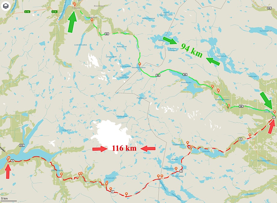 Anschlussroute weiter auf der Strasse Nr 7 – 116 km über Geilo am nördlichen Rand der Hardangervidda bis Hol