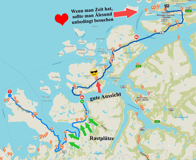 - Der nächste Höhepunkt ist der Aksla – die tollste Aussicht auf die Stadt und die Fjordregion. Es gibt ein paar Parkplätze (N62.474544, E6.164896) oben, aber im Sommer dürfte sie schnell voll sein. Alternative 1 ist der Parkplatz beim Aksla Stadion mit einem sehr großen Parkplatz, geöffnet von Freitag bis Sonntag und außerhalb ein paar Parkplätze (N62.476363, E6.186976). Von dort ist es ein Fußmarsch von ca. 1,3 km bis zum Aussichtsplatz. Alternative 2 ist der Wohnmobilparkplatz am Fjord allerdings ist dies ein Gebührenparkplatz, aber in der Stadt die beste Variante N62.476648, E 6.159507. Von diesem Parkplatz ist es 1,1 km zum Aussichtspunkt mit mehreren Stationen dazwischen. Insgesamt sind 120 Höhenmeter zu überwinden. Weitere Informationen zu Ålesund. Unbedingt einen Spaziergang am Hafen und in die Altstadt. Es gibt ein Fischereimuseum (N62.473645, E6.148917), Ålesund Museum (N62.471608, E6.156964), Atlantikpark (N62.46527, E6.096945), von Wohnmobilstellplatz bis zum Atlantikpark sind es 4,4 km Fußweg – hier gibt es zahlreiche Wanderwege, Haus der Arbeitervereinigung (Jugendstilbau).