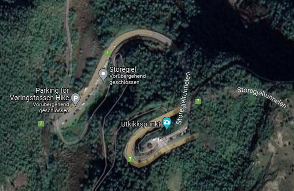 - Nach ca. 10 km und mehreren Tunnelfahrten kommt man hier aus dem Tunnel raus und hat eine 180° Kehre nach der es sofort links eine Zufahrt zum Parkplatz gibt mit einem guten Aussichtspunkt – Dalberg N 60.424205, E7.235507 (585 m Seehöhe). Vor Jahren sind wir Wanderparkplatz (Voringsfossen Hike9 zum Wasserfall gewandert. Man braucht feste Schuhe und ist nicht besonders anstrengend. Lt. Info ist er zur Zeit vorübergehend geschlossen.